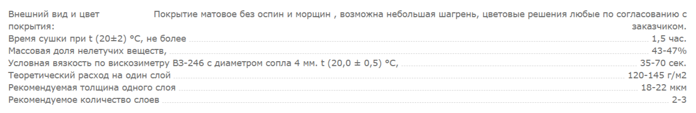 Срок службы системы покрытия из 2-х слоев эмали по загрунтованной поверхности металла сохраняет защитные свойства в условиях умеренного климата не менее 3-х лет, а три слоя по загрунтованной поверхности - не менее 6 лет. Эмаль отличается высокой водо и атмосферостойкостью.