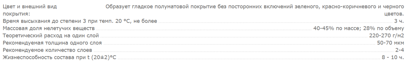 Способ нанесения:Безвоздушным распылением, кистью. Для приготовления композиции основу эмали смешивают с отвердителем, тщательно перемешивают и выдерживают в течение 20-30 минут до нанесения. Соотношение отвердителя и основы указывается в документе о качестве на каждую партию материала. Подготовленную эмаль наносят на поверхность защищаемого металла при температуре от - 15 °С до + 30 °С и относительной влажности воздуха не выше 80 %. Для исключения конденсации влаги температура поверхности должна быть выше точки росы не менее чем на 3 °С. После высыхания одного слоя (3 часа при температуре 20°С) аналогично наносят последующие слои эмали.