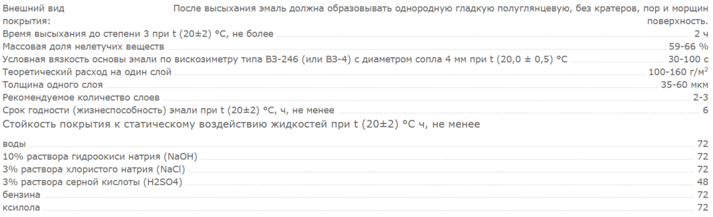 Покрытие на основе эмали обладает высокими противокоррозионными свойствами, светостойкостью, атмосферостойкостью и химстойкостью. Система покрытия из эпоксидной грунтовки "Эпотикс-01", ЭП-057, ЭП-076, ЭП-0199, и др.), и двух слоев эмали обеспечивает защиту на срок до 10 лет.