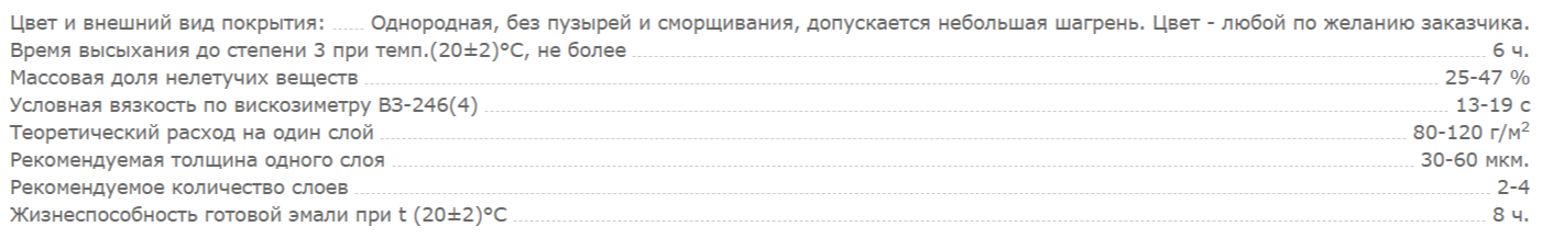 Покрытие является химстойким , защищает металлические конструкции от воздействия агрессивных газов и паров. Серебристая эмаль образует термостойкое покрытие, выдерживающее длительное нагревание до 250°С и кратковременное - до 300°С, остальные эмали - до 100-150°С.